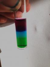 In general, salty water will settle lowest, then cold water, then warm water will stay on the top (note that after adding salty water, the salt mixes in and will make the whole tube salty, so that cold water will stay near the surface, sometimes even above a red layer (that is warm but now has some salt mixed in). Students will get their own unique results depending on what order and how much of each water type they add. They should be encouraged to look closely and observe water flowing in the tube when they add each type.