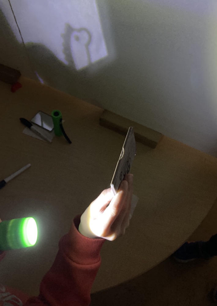 Summary Bounce light off a mirror. Write on the mirror, or use sticky notes, to make (reverse) images in the patch of light. Science content Physics: Light and Sound (1) Earth/Space: Sun, Moon, Solar System, Universe (1, 4, 6) Science competencies (+ questioning + manipulation + others that are in every activity) Questioning/predicting: predicting (1 up), hypothesizing (7) Planning/conducting: planning investigations (3 up) Processing/analyzing: comparing observations with predictions (1 up) Processing/analyzing: considering alternative explanations (5 up) Evaluating: inferring (3 up) Lessons activity is in Light stations Shadows from the sun The Moon Materials a clear sunny day (if outside) or a dim room and flashlights (if inside) large sheet of light-coloured paper (if outside) or white boards e.g. foam core on stands or against walls (if inside) small mirrors dry erase markers tissue to clean off mirrors optional: sticky notes and scissors Procedure If this activity is run inside: Show or challenge students to reflect the beam of a flashlight off a mirror and onto a white board. It will be easiest for them if they lay the mirror on the floor or desk, and then shine the flashlight down onto it at an angle, to make the light reflect back up onto the board (which is in front of them). Older students may also be able to hold the mirror and the flashlight and arrange the angles to reflect the light onto the board. If this activity is run outdoors on a sunny day: Mirrors can be used bend the sun's rays around an object and bring light into its shadow. Students may be familiar with seeing sunlight reflected off objects forming bright patches. Show students how to use a mirror to make a splash of light in the centre of their own shadow. Outside, they may find it easier to squat down to make a large shadow, then have the sun shine over their shoulder onto the mirror, which is tilted to reflect onto the ground in front of them. Younger students might need assistance with the placement of the mirror and themselves relative to the sun. A sheet of light paper makes the patterns more clearly seen on a rough or grey ground. Show all students that by drawing on the mirror, or by making a shape out of a sticky note, they can make patterns and shapes within the patch of reflected light. Challenge them to write their name or an image, so that it appears right-side-up inside the shadow. Help all students visualize the path that the light rays take, to reinforce how they are making their patterns, and how shadows are formed. Discuss some big ideas that students are discovering: Light goes in straight lines and can be reflected. Some surfaces reflect light, some do not. Activity on Moon's reflected light This activity can be used to demonstrate the Moon's appearance: the light areas reflect the sun's light and look white (made up of anorthosite, a kind of feldspar (the plagioclase form)), while the dark areas (basalt lava flows) do not reflect light and look dark. Grades taught Gr K Gr 1 Gr 2 Gr 3