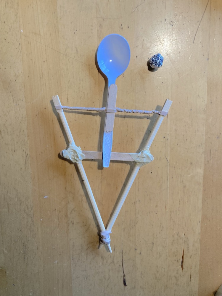 Summary Easy to build catapult. Fires a few metres. Science content Physics: Motion and Forces, Newton’s Laws, Gravity (K, 2, 6) Physics: Energy forms, Conservation of Energy (1, 3, 4, 5) Physics: Simple and complex Machines (5) Science competencies (+ questioning + manipulation + others that are in every activity) Questioning/predicting: predicting (1 up), hypothesizing (7) Planning/conducting: measuring (non-standard K up, standard 2 up) Planning/conducting: data collection/recording (K up) Processing/analyzing: comparing observations with predictions (1 up) Evaluating: inferring (3 up) Lessons activity is in Forces: chains of forces and combining forces Materials For catapult with chopstick frame: 2 chopsticks a popsicle stick and half a popsicle stick 2 wide elastic bands #64 works well, plus another to increase fire power plastic spoon masking tape For catapult with foam core frame: foam core/very stiff cardboard in a square U shape - see notes on cardboard elastic band, #64 works well and fires 4-5m plastic spoon small section of popsicle stick (cut one in thirds) For all catapults: aluminum foil to make ammunition firing line: either lines already in gym or masking tape measuring tape and tape to mark out firing distances in metres Procedure This is called a Torsion catapult. It gets its energy from twisting something. (A twisting force is called torsion). First documented use by ancient Macedonians (now Greece) in 330 BC, over 2000 years ago. They used twisted rope and tendons. The later Roman 'onager' is an example of a torsion-powered siege engine. Good for upper Primaries, or students in a smaller space. Catapult with chopstick frame: Upper Primaries can build their own. Lower Primaries will need help, or build their own frames ahead of time. Use an elastic band to bind together two chopsticks at their thin ends. Measure 7cm from the wide end of each chopstick and make a pencil mark on each. Open up the chopsticks then hold the popsicle stick between the two chopsticks at the pencil marks. Attach firmly with tape. Stretch an elastic band between the wide ends of the chopsticks. Insert the half-popsicle stick through the elastic at the midpoint, then turn it to twist up the elastic. Without letting go, insert the plastic spoon through the elastic on top of the half-popsicle stick. The spoon should now be stopped by the whole popsicle stick, so that the elastic does not untwist. Make sure the spoon is inserted the correct way to use as a bucket for ammunition - if not, turn it while still inside the elastic band. Hold the chopstick frame upright, pull back the spoon, place a tin foil ball in the spoon, then let go. Catapult with foam core frame: Prepare the foam frames in advance - note it takes some time for a class set. Students build their catapult (with help if necessary): stretch the elastic band over the arms of the foam core. Then use the piece of stick to twist up the rubber band before sliding the spoon in, orienting it so that it acts as the arm of the catapult. Firing catapults While staying behind a line, fire balls of tin foil, and record how far they go. Optionally graph the distances, along with how large the foil ball is. Discussion of Forces in the catapult: 1. Force from your fingers to wind up the elastic. Energy is now stored in the elastic. 2. Force from the elastic on the spoon to make it move. It pushes the ammo in to the air. 3. The ammo falls because of the force of gravity. There is a chain of forces. Ask students how they got the ammo to go further, then they try. e.g. Pull the spoon back further Change the angle of attack Change the size of the ammo. Wind the elastic up more. It holds more energy. It can move the spoon faster, to project ammo faster. Double up elastics. Even more energy in the elastic. Notes Cardboard from a thick box collapses at the bottom of the U after a couple of tries. Stick with foam core or test your cardboard well first. The U shape is a lot of prep for a whole class, but the simple build is good for younger students. Grades taught Gr K Gr 1 Gr 2 Gr 4 Gr 5 Gr 6