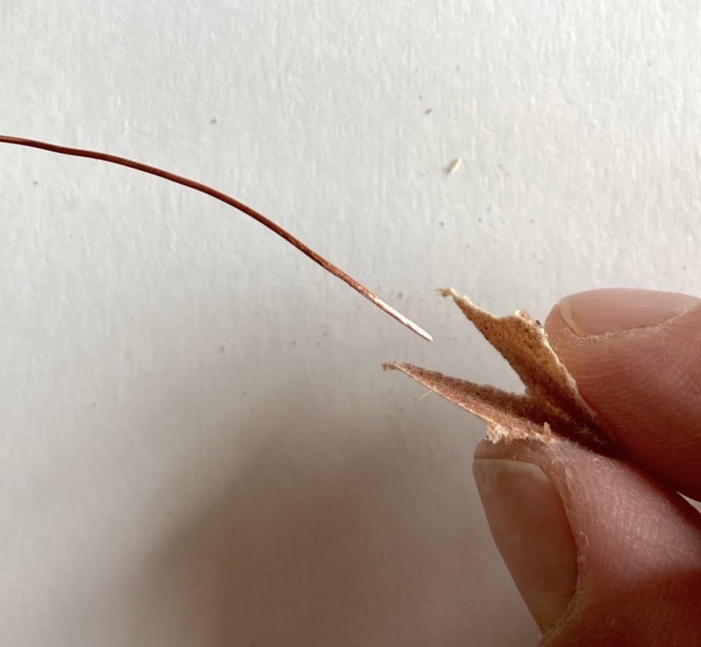 Use the sandpaper to remove the plastic coating from about 2cm of each end of the wire (do this ahead of time for younger students). You will see the silvery-copper wire colour underneath.