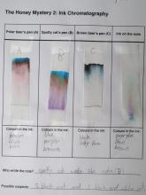 Summary In the second lesson of the Honey Mystery, students narrow down the suspects further with evidence in a written note. An adjacent lesson uses ink chromatography to create abstract art. Science content Chemistry: Physical Changes, Solutions, Mixtures and Separating (2, 4, 5, 6) Activities in this lesson Chromatography with black markers and forensics of ink on a note Chromatography with coloured marker pens Materials Remaining suspects from the previous lesson (The Honey Mystery 1): black and brown bear, black cat, black and white cat three informant stuffies, only one a cat, one a bear, any colours three black pens and a note written with one of them, in the posession of the the three informant stuffies coffee filters washable coloured ink pens (dark colours often work best) small tubs of water Q-tips Procedure Reintroduce the remaining suspects from the previous lesson (The Honey Mystery 1) It should be the back and white cat, the black and brown bear and the black cat. Dramatize a note being brought to you: Since I saw you last, I received some interesting news. This envelope was hand delivered by three very small, scared animals (show stuffies). They threw me the note, then ran away. “My sister was so hungry. It was she that stole the honey from Pooh”. If we can figure out who wrote the note, maybe it will help us figure out who stole the honey. I called them back and asked them to tell me more, but all they would do is hand over their pens. We will do a technique called chromatography to figure out who wrote the note. This technique is used by scientists to separate the colours in inks from a pen, or to separate the colours in lipstick or paint found at a crime scene. Do first activity (Chromatography with ink pens (black) and ink on a note). (In our lesson it was the spotty cat that wrote the note, so her cousin, also a cat, stole the honey. This eliminates any bear suspects, and leaves the two cats as suspects). We can also use chromatography to make some amazing patterns. Do an art activity with chromatography of coloured pens. Follow this lesson with The Honey Mystery 3. Grades taught Gr K Gr 1 Gr 4 Gr 5
