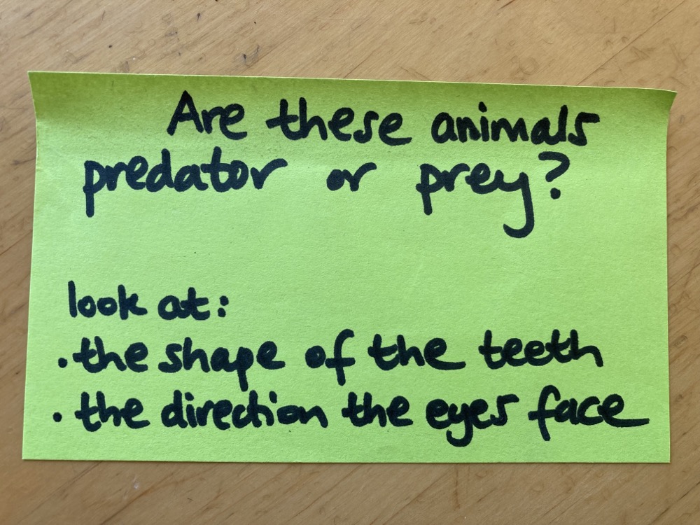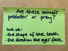 Summary Compare predator and prey skulls for eye placement and teeth shape. Science content Biology: Features, Adaptations of Living Things (K, 1, 3, 7) Biology: Classification of Living Things, Biodiversity (1, 3) Biology: Food Webs, Ecosystems, Biomes (3, 4) Biology: Evolution, Natural Selection (7) Science competencies (+ questioning + manipulation + others that are in every activity) Processing/analyzing: classifying data, finding patterns (1 up) Evaluating: inferring (3 up) Lessons activity is in Bones and the Skeletal System Animal adaptations for Primaries Biodiversity Food chains Materials skulls from predator and prey animals Procedure Students look and carefully handle the skulls. Ask them which is from a predator animal and which a prey, by looking at the positon of the eye sockets and the shape of the teeth. Prey animals have their eyes on the sides of their head, so they can see all around them and spot approaching predators. Their teeth are wide and flat, for grinding plants. Predator animals have their eyes in the front of their head, allowing them to see in stereo and so accurately gauging the distance away of animal to chase. Predator teeth are sharp, to rip flesh. Notes Best as a station that can be monitored, or passed around a circle. Grades taught Gr K Gr 1 Gr 2 Gr 5 Gr 6