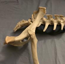 Start with the skull, then cervical vertebrae to continue down spine. Then add shoulder blades, front legs. Last add pelvis, back leg (part of one bag leg missing).